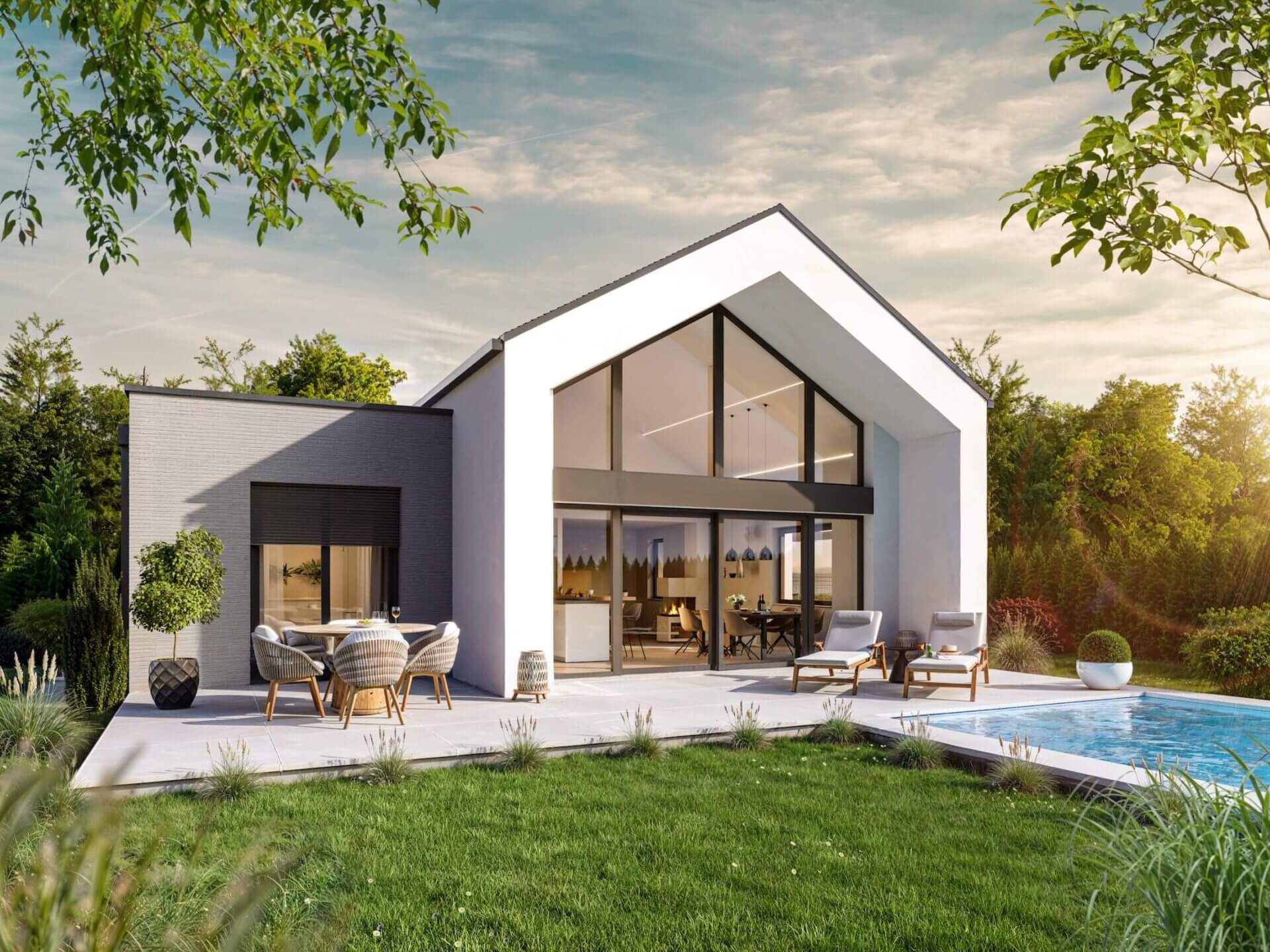 Vellaro ist ein zeitlos eleganter Satteldach-Bungalow, dessen großzügige Glasfront zum Garten echte Wow-Momente schafft. Der bis unter das Dach offene Wohnraum wirkt modern, leicht und sorgt für eine besondere Atmosphäre und ein einzigartig entspanntes Wohngefühl.