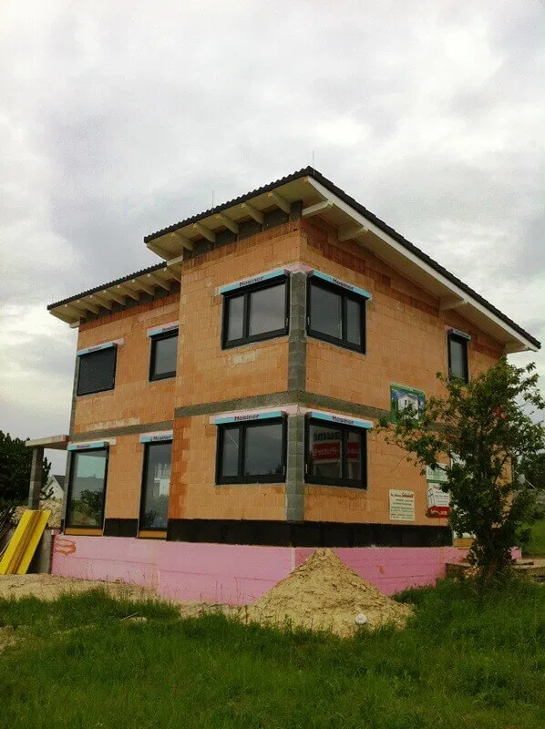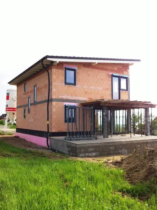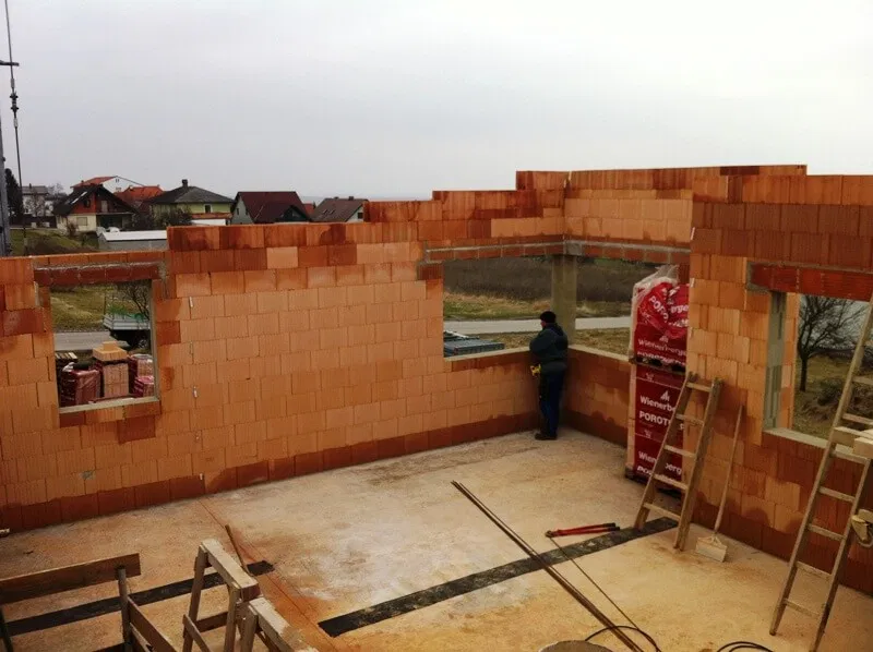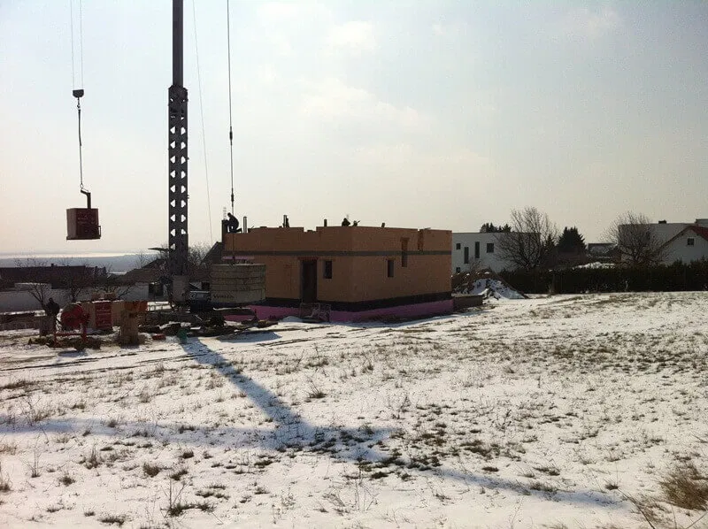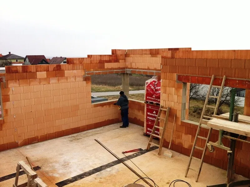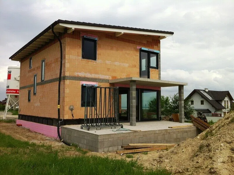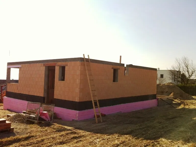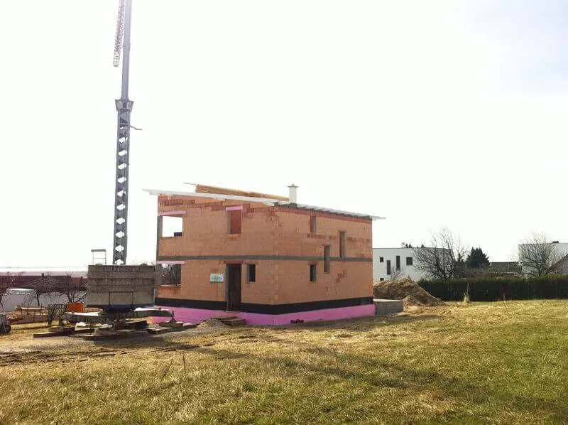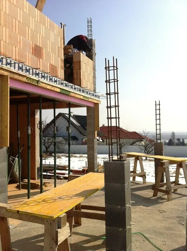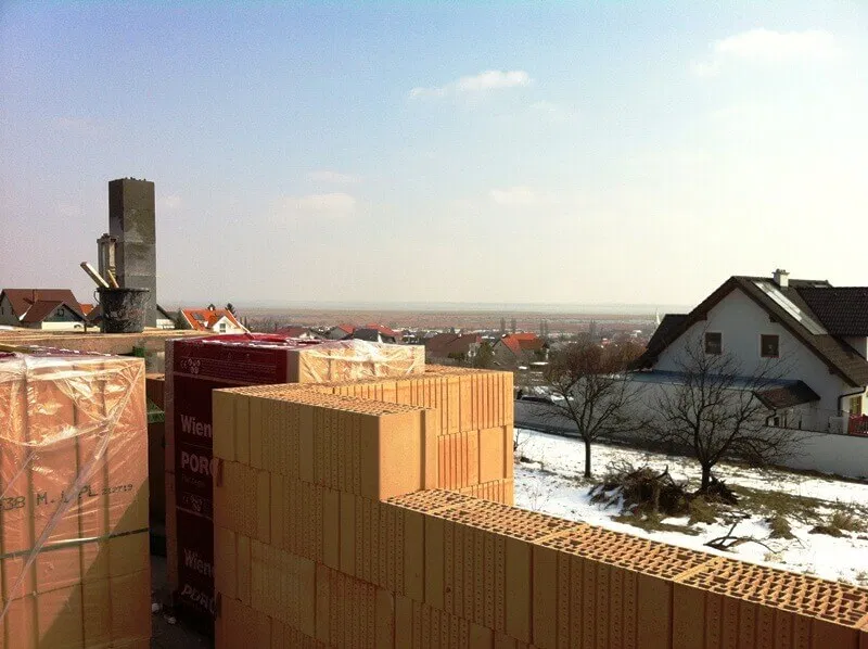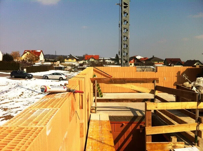 Um das zu erreichen, wurden die  Außenwände an den Giebelmauern und die Zwischenwände im Obergeschoß fertiggestellt. Um einen optimalen Arbeitsablauf zu gewährleisten wurde bereits nebenbei mit dem nächsten Einfamilienhaus in Au am Leithaberge begonnen.