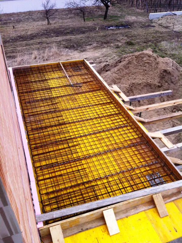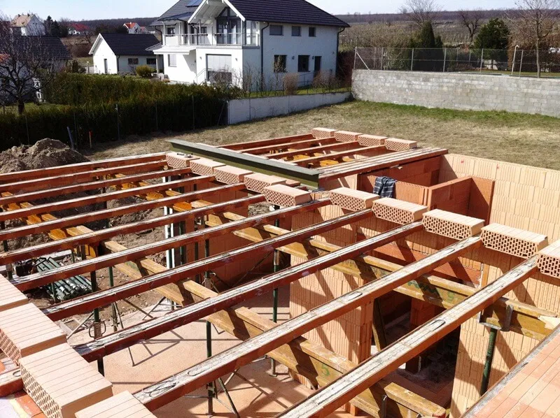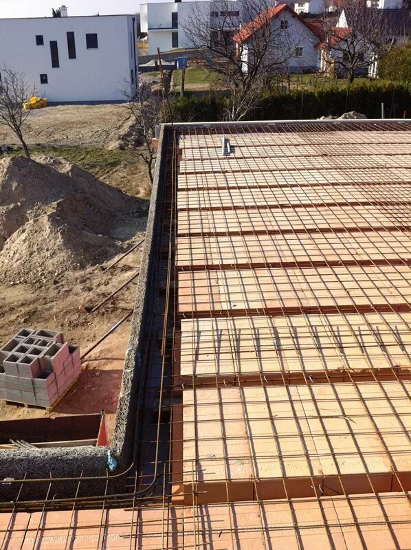 Nachdem der Bauherr von mir die Fotos von der Terrasse bekam entschied er sich kurzfristig die Terrasse etwas zu vergrößern. Mit einem kurzen Telefonat wurden die Details abgestimmt und die Änderungen wurden vorgenommen. Die Vergrößerung stellte für uns kein großes Problem dar und wir setzten dies kurzerhand vor Ort um. Am Dienstag wurde mit den Verlegearbeiten der Ziegeldecke begonnen danach wurde die Abschalung gerichtet und die Decke bewehrt. Die Terrasse wurde noch hinterfüllt, abgeschalt und bewehrt. Somit können wir am Freitag die Erdgeschoßdecke und die gesamte Terrasse betonieren. Ziel erreicht!