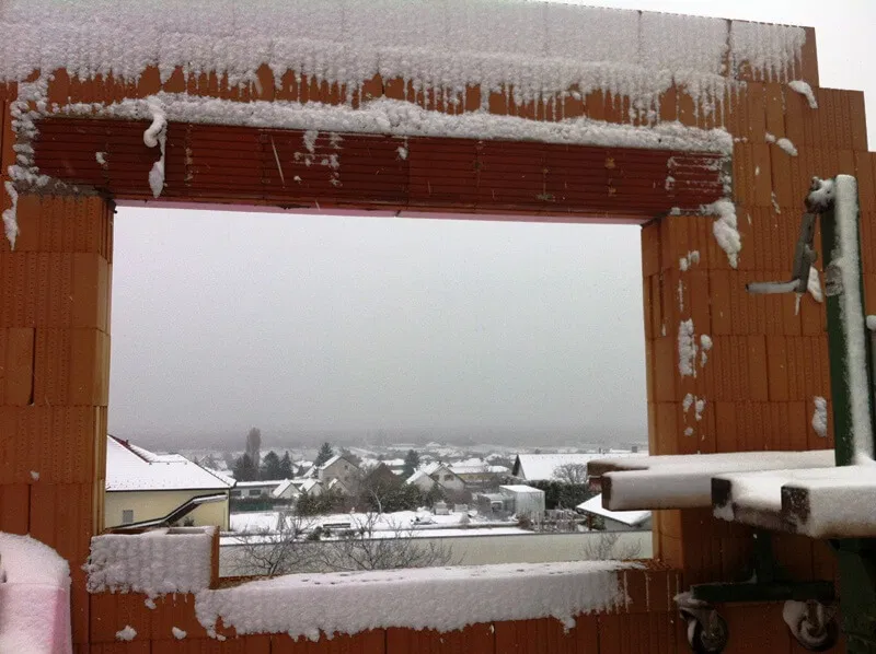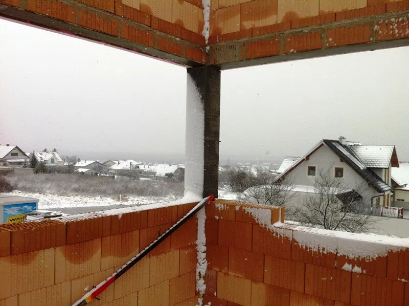 Winter! Er begrüßte uns mit viel Schnee und eisigen Temperaturen. Daher mussten wir den geplanten Beginn der Mauerarbeiten im Obergeschoß verschieben. Erst am Mittwoch konnte begonnen werden aber es ging rasch voran. Denn das Team vor Ort setzt alles daran, die verlorene Zeit wieder wettzumachen. Es wurde die erste Schar Ziegel auf der OG Decke angesetzt und das Außenmauerwerk aufgemauert.