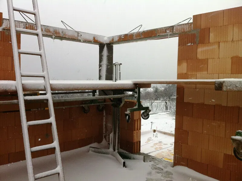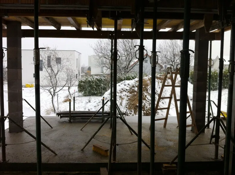 Der Winter ist hartnäckig. Wieder einmal Schnee und Kälte. Dennoch gab die Partie ihr bestes und so konnten wir unsere Ziele für diese Woche knapp aber doch erreichen! Die Außenwände im Obergeschoß wurden fertiggemauert und der Schließrost bewehrt und betoniert. Die Unterstellung für den Balkon wurde hergestellt und die Balkonplatte bewehrt und betoniert.