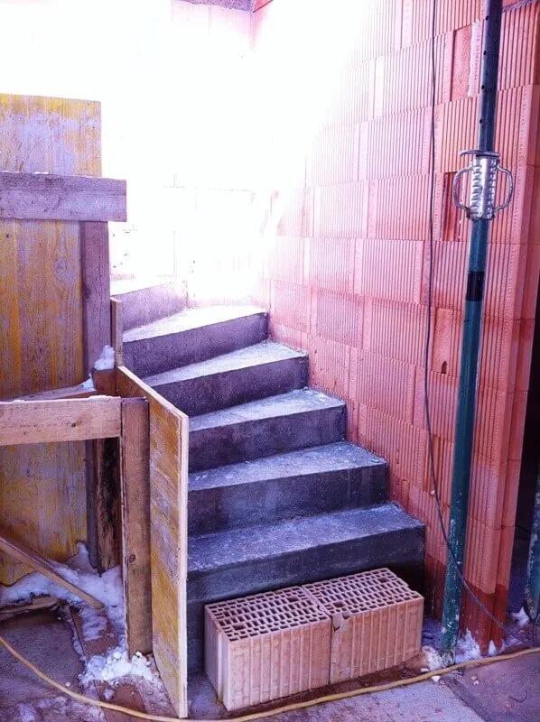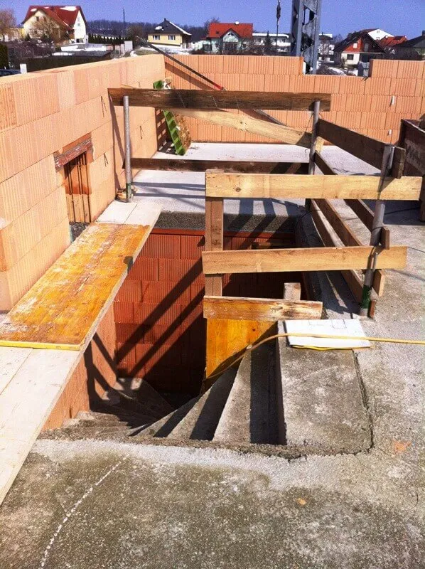 Die neue Woche begrüßte uns mit sehr niedrigen Temperaturen und starkem Wind. Daher mussten wir am Montagnachmittag die Arbeiten unterbrechen, aber bereits am Dienstag konnten wir wieder loslegen. Die Mittelmauer und die Zwischenwände wurden fertiggemauert und die Unterstellung für die Ziegeldecke gerichtet. Die Stiege wurde geschalt, bewehrt und die Stufenbretter eingebaut.