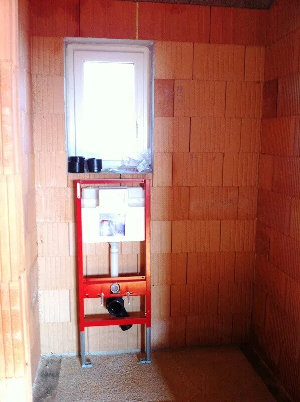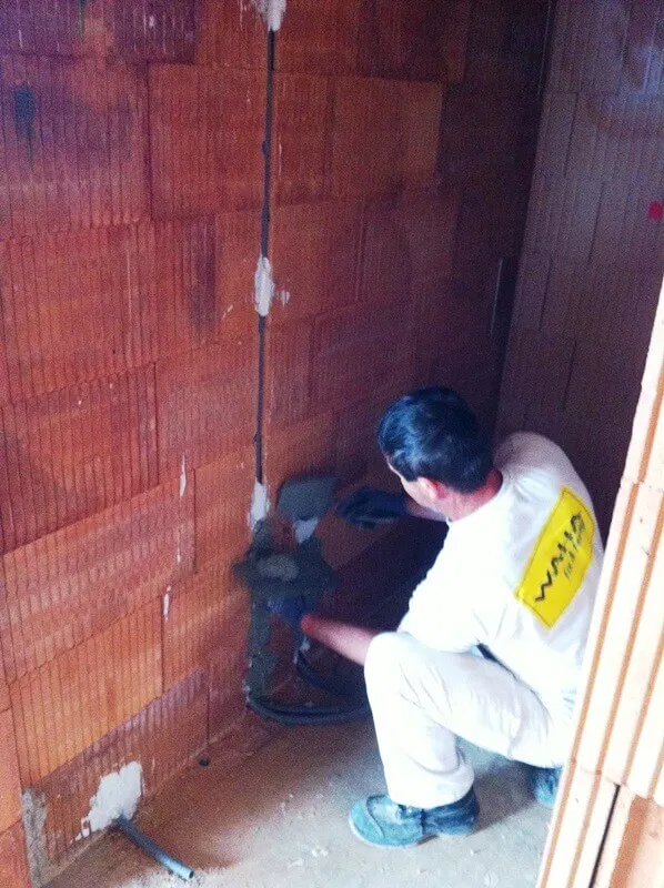 Der Startschuss für die Arbeiten im Inneren des Hauses war am Montag den 22.4.2013. Zeitgleich begannen Elektriker und Installateur mit den Stemm- und Verlegearbeiten der Leitungen. Im Sanitärbereich wurde der erste WC- Unterputz-Spülkasten gesetzt und die Auslässe für die Steckdosen gebohrt. Der Blitzschutz wurde an die bereits im Fundament verlegten Erdungsleitungen angeschlossen und über Dach geführt.