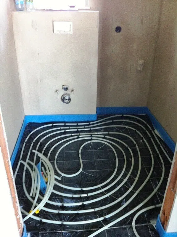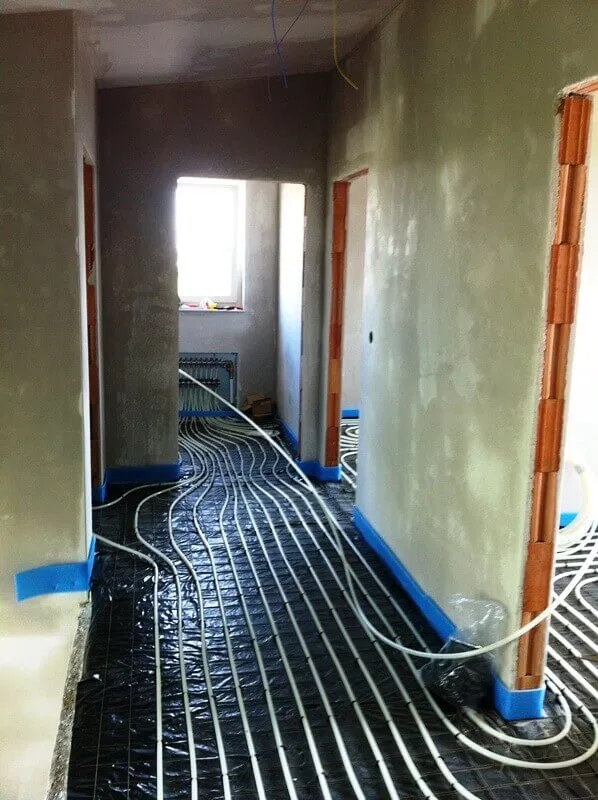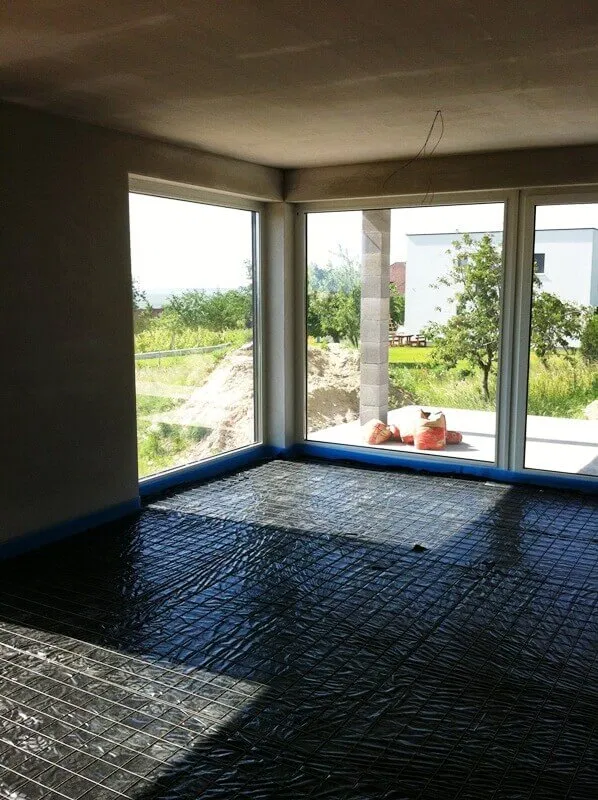 Am Montag wurde mit den Arbeiten der Fußbodenkonstruktion begonnen. Dämmplatten wurden entsprechend dem Energieausweis ausgewählt, in allen Räumen verlegt und die Estrichrandstreifen montiert. Danach konnte gleich mit dem Verlegen der Fußbodenheizung begonnen werden. Die Gittermatten für die Befestigung der Heizungsschläuche wurden verlegt und im Obergeschoß wurde mit dem Montieren der Schläuche begonnen.