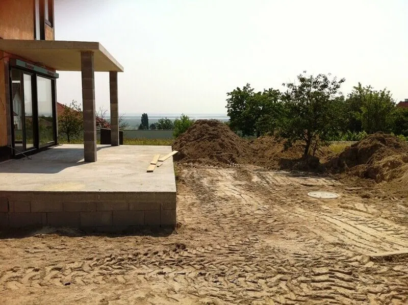 12:00-17:00 Einsanden der Leitungen, Verlegen des Schmutzwasserkanals vom Schacht zum Haus